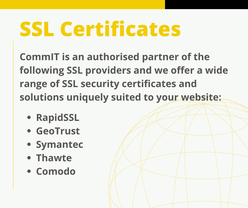CommIT offers a wide range of SSL security certificates and solutions uniquely suited to your website. We are an authorised partner of the following SSL providers: